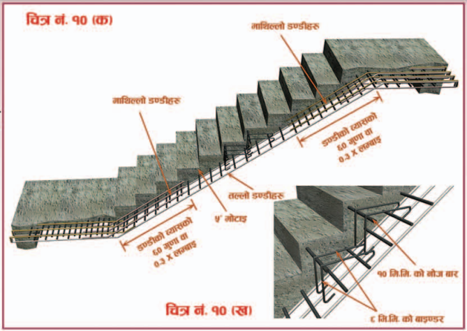 भर्याङको खुड्किलाहरु ढलान गर्नुपरेमा १० मि.मि.को नोजबार राख्नुपर्छ र नोजबारलाई चित्रमा देखाए झैं ८ मि.मि.का बाइण्डद्धारा बाँध्नुपर्छ । (हेर्नुहोस् चित्र नं. १० ख)