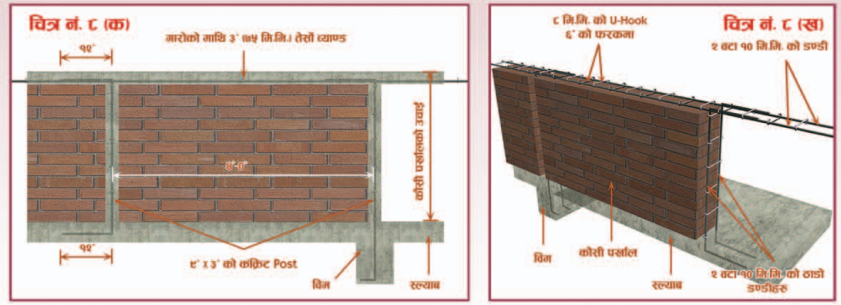 कौसी-बरण्डाहरुको गारोलाई सुरक्षित पार्न पारापेट ब्यान्डहरु राख्नुपर्छ । यसमा कौसी, बरण्डामा लगाउने गारोहरुमा बढीमा ४–४ फिटको दुरीमा स्ल्याब र बिमहरुबाट २-२ वटा १० मि.मि.को डण्डीहरु निकाल्नुपर्छ । र, डण्डी रहेको ठाउँ वरिपरि ८ मि.मि.को यु–हुक रिङ्गहरु देखि ९”×३” को पोस्ट ढलान गर्नुपर्छ । त्यसपछि गारोको माथि वारपार चित्रमा देखाए झैं गरी १० मि.मि.को २ वटा तेस्रो डन्डीहरु राखी ०”–३” मोटाइको तेस्रो ब्यान्ड ढलान गर्नुपर्छ । (चित्र नं. ८ क र ८ ख हेर्नुहोस्)