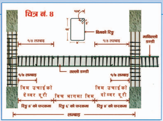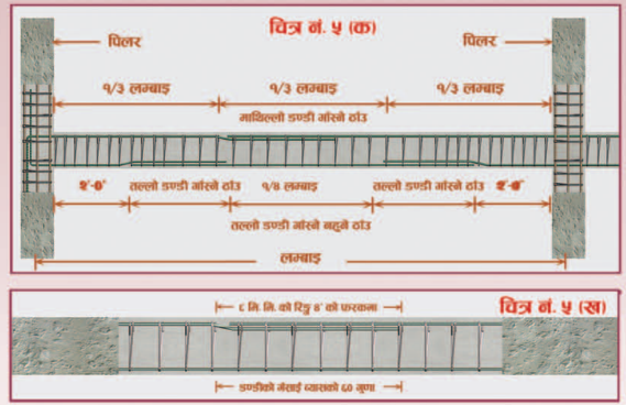 बिममा कम्तिमा ५ लाइन (१६ मि.मि.)को २-२ वटा डन्डीहरु तल्लो र माथिल्लो तहमा अनिवार्य रुपमा राख्नुपर्छ । यसको साथै बिमको लम्बाइ अनुसार तलमाथि थप डन्डीहरु राख्नुपर्छ । माथिल्लो तहमा बस्ने डन्डीहरुथप गर्दा चित्र नम्बर ४ ‘क’ मा देखाए झैं पिलरको बीचदेखि अर्को पिलरको बीच भागको लम्बाईको चार भागको एक भाग लामो हुनुपर्छ । उक्त लम्बाई पिलरको भित्री मोहोडाबाट नापिनुपर्छ ।