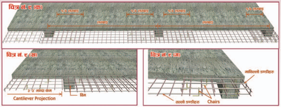 टप १ मिटरसम्म भएमा टप भागमा स्ल्याबको माथिल्लो डण्डीहरु ३ लाइन (१० मि.मि.)को ६–६ इन्चको दुरीमा राख्नुपर्छ । (चित्र नं. ९ ख हेर्नुहोस्) माथिल्लो डण्डीहरु भएको ठाउँमा डण्डी अड्याउन डण्डीको कुर्ची राखिनुपर्छ ।
