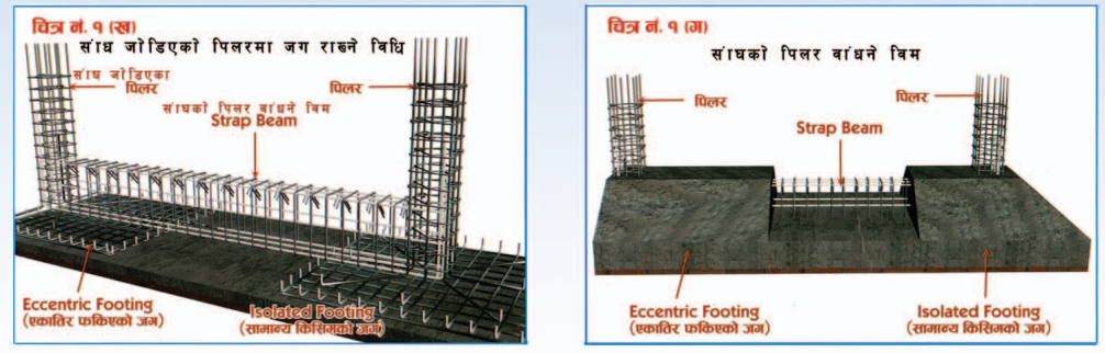 छिमेकीको साँधसँग जोडिने गरी राखिएको पिलरहरुको जगमा दुईवटा पिलरको लागि संयुक्त जग निर्माण गर्नुपर्छ वा जगहरुलाई स्ट्रयाप बीमद्धारा जोड्नुपर्छ । चित्र नम्बर १ ख र १ ग मा हेर्नुहोस्