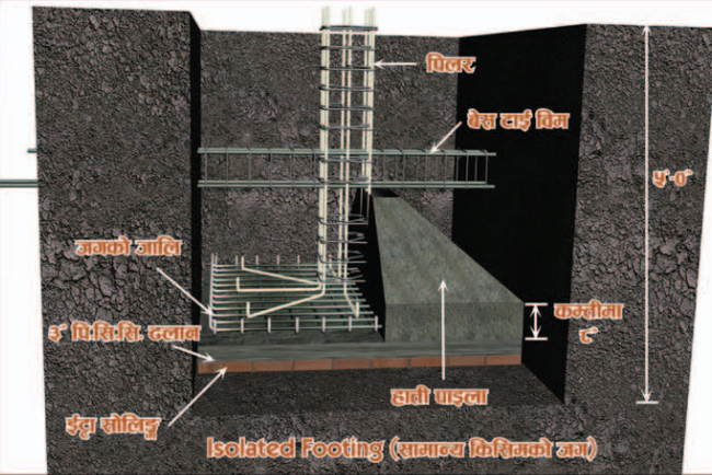 जगको गहिराइ कम्तिमा ५’०” हुनुपर्छ । पुरुवा माटोमा जग निर्माण गर्नु हुँदैन । जमिनको साविकको (ओरिजिनल) माटो भएको गहिराइसम्म पुग्ने गरी जग निर्माण गर्नुपर्छ । स्लोप गरी जग निर्माण गर्दा छेउको मोटाइ कम्तिमा ८” हुनुपर्छ । तपाईंले चित्र नम्बर १ ‘क’ मा हेर्न सक्नुहुन्छ ।