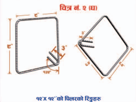 पिलरमा राखिने रिङहरु कम्तिमा ८ मिलिमिटरको हुनुपर्छ र बिमको तल र माथि २’०” उचाइसम्म ४–४ इन्चको फरकमा हुनुपर्छ भने बाँकी मध्य भागमा ६–६ इन्चको फरकमा राख्नुपर्छ । तर, टाइबिम मुनि सबै रिङहरु ४–४ इन्चको फरकमा राख्नुपर्छ । रिङ हुक चित्रमा देखाएजस्तै ३” लामो भित्रतिर १३५ डिग्रिमा मोड्नुपर्छ । चित्र नम्बर २ घ मा हेर्न सक्नुहुन्छ ।