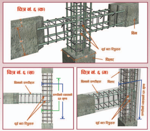 बिमको सबै डन्डीहरु पिलरकवो डन्डीको भित्रबाट लग्नुपर्छ । (चित्र नं. ६ क हेर्नुहोस्) बिम टुँगिने स्थानका पिलरहरुमा बिमको डन्डीहरु डन्डीको ब्यासको ६० गुनास लम्बाइ बराबर पिलरको भित्री मोहडाबाट हुने गरी पिलरमा मोड्नुपर्छ । तल्लो डन्डीहरु माथि मोड्नुपर्छ र माथिल्लो डन्डीहरु तल मोड्नुपर्छ । (चित्र ६ ख र ६ ग हेर्नुहोस्) बिम र पिलर जोडिएको ठाउँमा पिलरभित्र कम्तिमा ४ इन्चको दुरीमा रिङ्गहरु राख्नुपर्छ ।